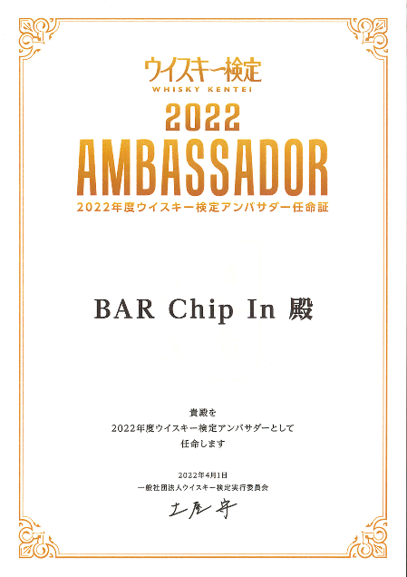当店は、一般社団法人ウイスキー検定実行委員会が創設した「ウイスキー検定」のPR活動を行うための協力店として"ウイスキー検定アンバサダー"を拝命しております。