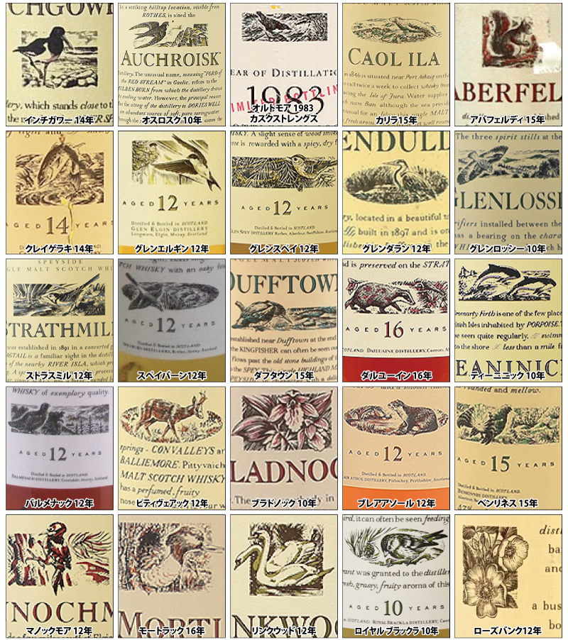 その後、1997年にギネスグループとグランド・メトロポリタン・グループが合併しDIAGEO(ディアジオ社)が誕生しことに伴い2001年頃に、新たに4本(オスロスク、グレンエルギン、グレンスペイ、ストラスミル)がラインナップ追加され、合計26本になりました。上のクライヌリッシュを除く、25本のデザインをを全て集めたのが下の写真です。