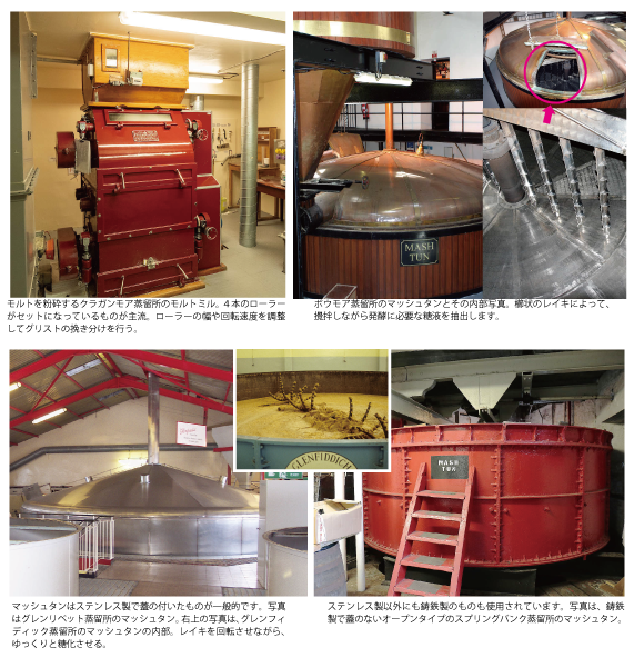 ※因みに、サラディン式製麦法とは、伝統的なフロアモルティングと、現在のドラム式モルティングの中間的製法で、19世紀後半にフランス人のサラディン氏によって考案された方法です。大きい部屋の床を四角に区切り(これがサラディンボックス)、そこに大麦を入れ下から空気を送って攪拌する方式で大幅に効率が上がり、経済的であったらしく、その後いくつかの蒸留所にも導入されましたが、現在でも残っているのは「タムドゥー蒸留所」だけです。