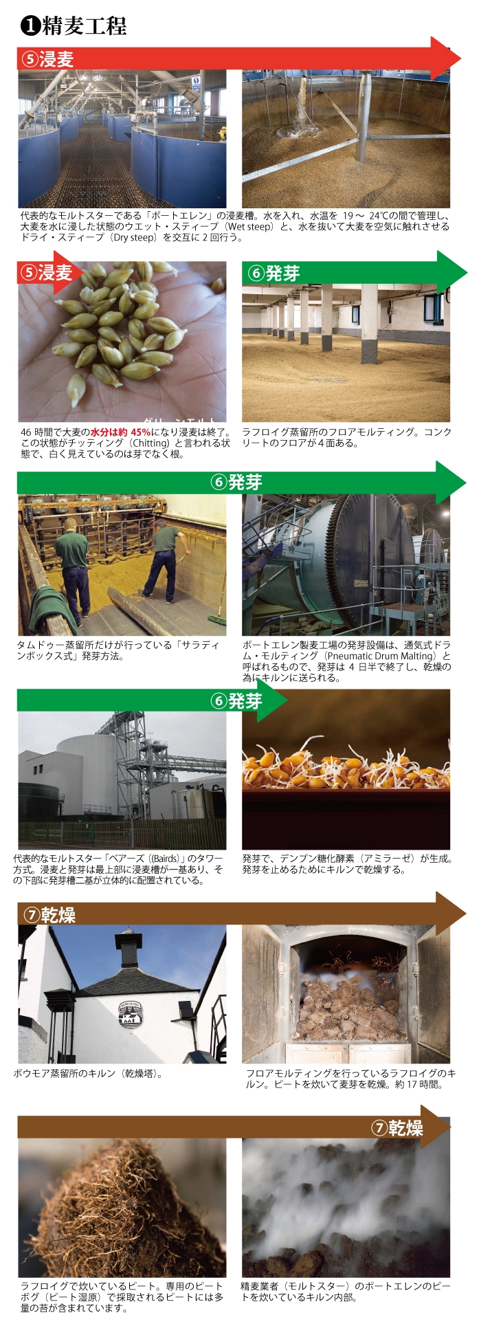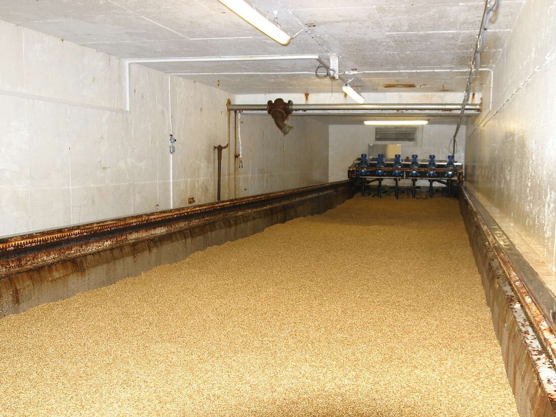 収穫直後の大麦の含水率は16~20%程度ですが、それを乾燥させ、含水率13%程度に落とします。そして浸麦後には45%に高められます。こうして5日~1週間をかけて発芽を促し、麦粒の全長に対して芽の長さが8分の5から3分の2程度になった時点で発芽を完了させます。発芽の進行を止め保存性を高めるために熱源を当てて麦芽を乾燥させます。この工程には、伝統的にキルンと呼ばれる乾燥塔で行われて来ましたが、現在ではフロアモルティングを行っている一部の蒸留所でしかキルンは使われていません。乾燥させて4~5%程度まで水分を落としたものが麦芽、すなわちモルトです。