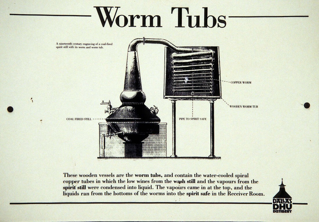 ワームタブとは、蛇管式と言われる冷却装置のことで、ワーム(コイル状をした銅製のチューブで先端に行くに従って細くなった構造を持つ冷却装置)管を通るアルコールの蒸気を冷却する巨大な桶のこと。木製のものと金属製のものがある。現在は、シェル&チューブ式のコンデンサーが主流で、それに比べると効率は悪いが、時間をかけて液化させることで、香り豊かなスピリッツになるという。
