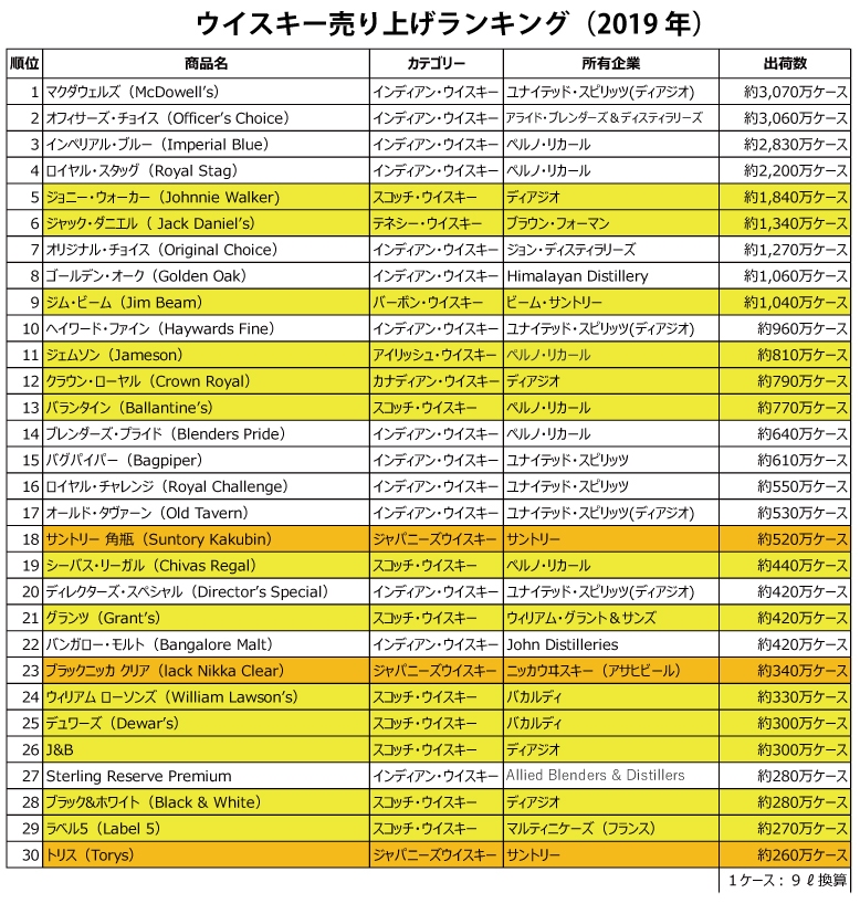 因みに、2019年の年間データは以下の表を参照。ジョニーウォーカーでさえ、世界の売上ランキングにすると第5位。1~4位は、インディアンウイスキーが独占している状況。既に世界5大ウイスキーという分類が現状に合っていない気がしますが。。。