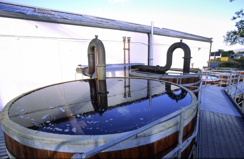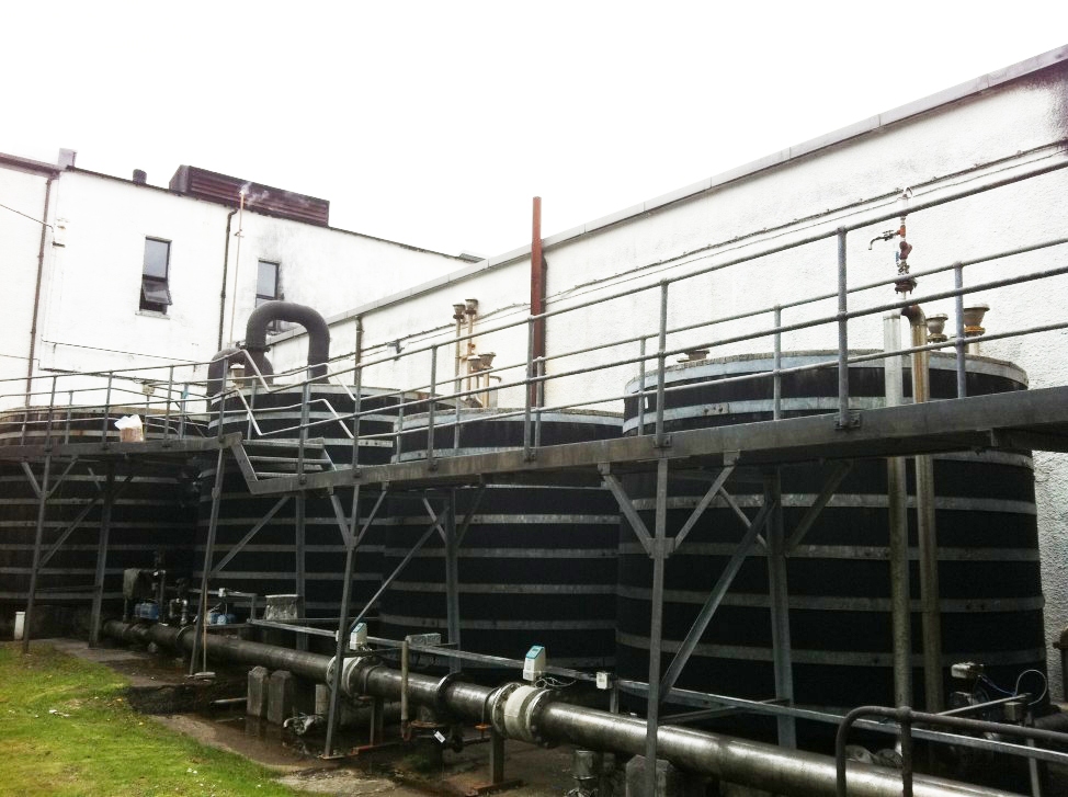 下の2枚の写真はタリスカー蒸留所のもの。全部で5槽あるワームタブのうち、手前の3槽が再留釜用、奥が初留釜用の2槽。
