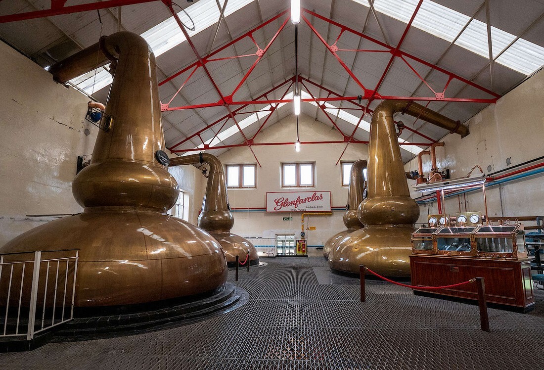 グレングラントのポットスチルは、バルジ型(変形ポール型)と、ストゥーパ(仏舎利塔)の2タイプで、初留、再留合計8基。全てに精留器が取り付けられています。