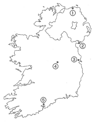 右のアイルランドの地図の中からキルベガン蒸留所がどれに当たるか、その番号を答えよ。